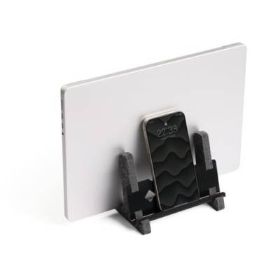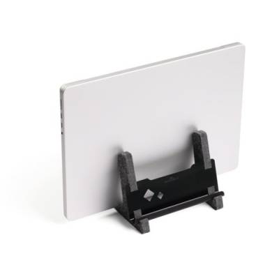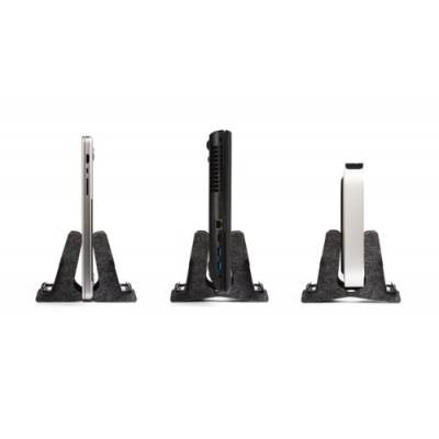 - Introducing our sleek, space-saving vertical laptop stand made from environmentally conscious materials. Crafted from 60% recycled felt it features an integrated shelf for tablets or mobile phones, optimising workspace efficiency. The stand's design promotes air circulation to minimise overheating in closed display mode, extending your laptop's lifespan.