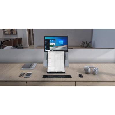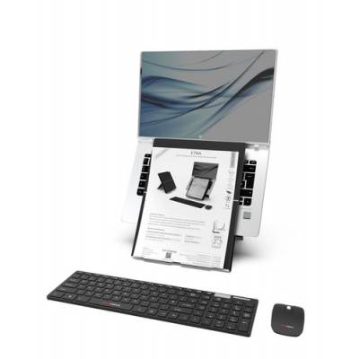 It has been developed to fit the majority of the laptops available on the market. The height adjustable design allows Etra to raise the laptop to a comfortable working position. Its pivotable full document holder ensures a very easy setup and ergonomic use.