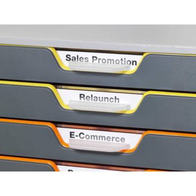 The unit includes transparent labelling windows and easily exchangeable printable inserts with digital templates for easy organisation.