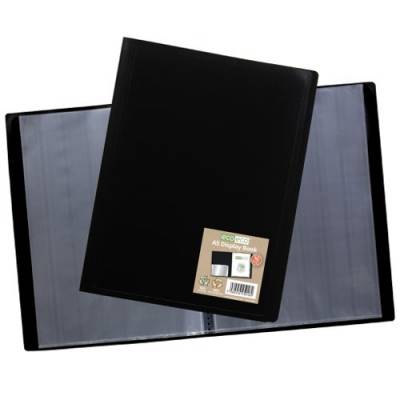 - Strong and flexible black 400 micron cover display book, ideal for home, office and professional use. Clear additional storage pocket featured inside of front cover to house loose items and documents. A total of 40 pages (80 sides to view) securely bound for optimum and multi-purpose filing. 40 micron pages are acid free, smooth, glass clear and copy safe. These pages securely hold A5 documents. Made from 100% recycled materials, product and packaging both 100% recyclable.