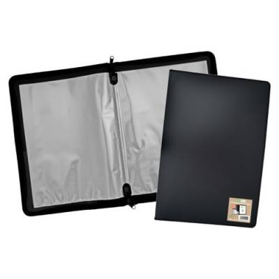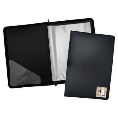 - Strong black 1000 micron cover zipped display book, ideal for home, office and professional use. Zipped closure to keep contents safe and secure, ideal when travelling. Clear additional storage pocket featured inside of front cover to house loose items and documents. A total of 30 pages (60 sides to view) securely bound for optimum and multi-purpose filing. 50 micron pages are acid free, smooth, glass clear and copy safe. These pages securely hold A2 documents. Responsibly sourced materials and responsibly produced. Made from 50% recycled materials, product and packaging both 100% recyclable.