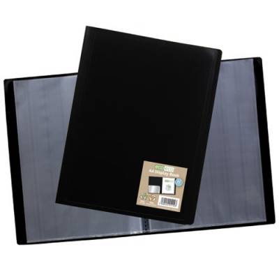 - Strong and flexible black 400 micron cover display book, ideal for home, office and professional use. Clear additional storage pocket featured inside of front cover to house loose items and documents. A total of 60 pages (120 sides to view) securely bound for optimum and multi-purpose filing. 40 micron pages are acid free, smooth, glass clear and copy safe. These pages securely hold A4 documents. Responsibly sourced materials and responsibly produced. Made from 100% recycled materials, product and packaging both 100% recyclable.