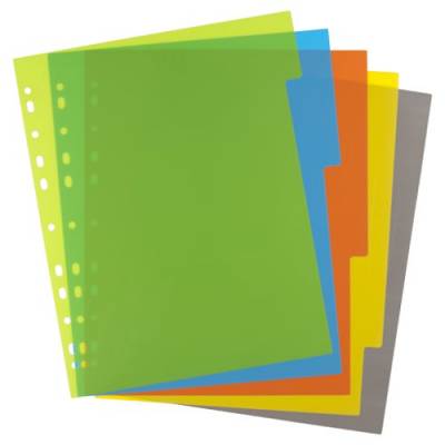 Strong 200 micron strength A4 size file dividers, ideal for home, office and professional use. Set of 5 dividers colour coded for the filing and organising of paperwork and documents in ring binders and files. Extra wide for use with multi-punched pockets. Contents page templates can be downloaded from our website. Responsibly sourced materials and responsibly produced. Made from 50% recycled materials, product and packaging both 100% recyclable.