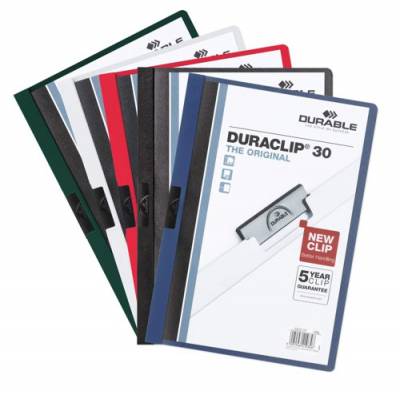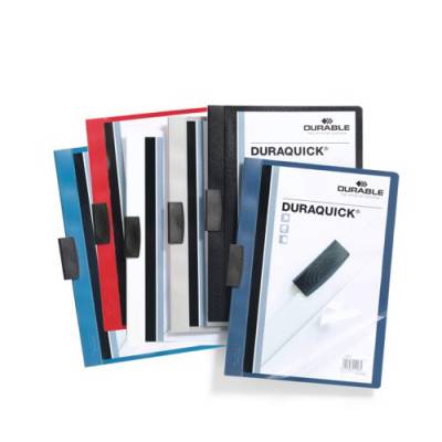 - The clip folder with style DURAQUICK® comes with a new clip design for smoother operation. It is ideal for protecting, organising and presenting un-punched documents. The design features a transparent anti-glare, anti-tear front cover and sturdy elastic clip made of hard wearing plastic.