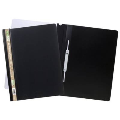 - Strong A4 file, perfect for projects and reports, ideal for home, office and professional use. This file securely holds up to 25 sheets of punched A4 paper (80gsm) with its 2 pronged mechanism. Clear front cover 180 micron and black back cover 350 micron. Removeable spine presentation card for personalisation. Responsibly sourced materials and responsibly produced. Made from 50% recycled materials, product and packaging both 100% recyclable.