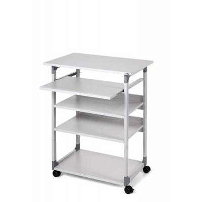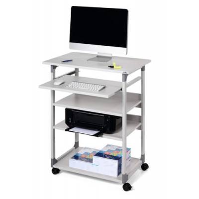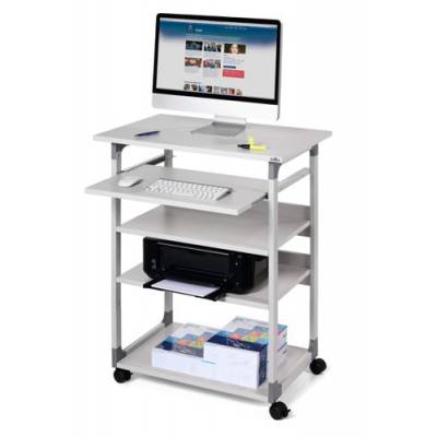 - Introducing Durable’s Mobile Computer Table – the perfect solution for busy workspaces needing quick access to computer equipment. This versatile workstation features four durable shelves, two of which are height-adjustable, providing flexible storage options for various office essentials.