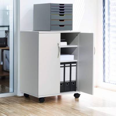Introducing the versatile Multi-function Trolley from Durable. With two built-in shelves, two adjustable shelves, and hinged doors for discreet storage, it's perfect for any office setting.