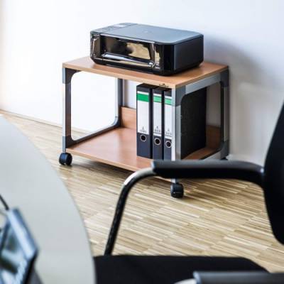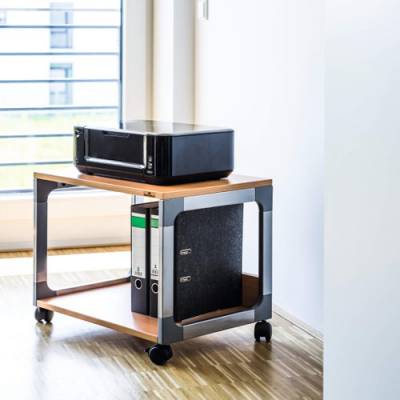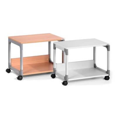 - High quality, two-level multi-function/printer trolley. Designed with strong metal powder coated frame with glass enforced plastic corners. The top and bottom shelves are made from 19 mm thick, melamine covered hardboard. Perfect for holding printers and other similar electrical office appliances. Maximum weight per shelf - 30kg. Overall dimensions: 477 x 600 x 432 mm (H x W x D)