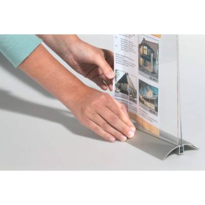 An elegant table sign perfect for professionally displaying information, menus, flyers etc. Strong crystal-clear acrylic panels ensure durability and readability and a machined aluminium base keeps the design stable.