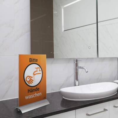 - An elegant table sign perfect for professionally displaying information, menus, flyers etc. Strong crystal-clear acrylic panels ensure durability and readability and a machined aluminium base keeps the design stable.