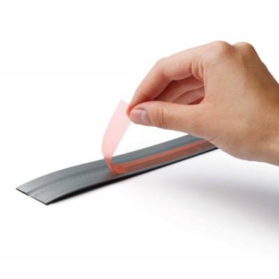 Magnetic clipping strip for documents, notes and posters that can be cut Individually to size. The self-adhesive backed strip can be attached to a variety of surfaces such as walls, whiteboards and cabinets.