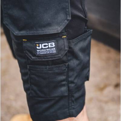 - The JCB hybrid stretch shorts are designed for all day working comfort. Stretch panels make them incredibly comfortable to keep you moving with confidence all day long. For working convenience, holster pockets are reinforced for durability.