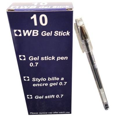 - Supplied in a pack of 10, these black gel pens are filled with quality ink with pigment suspended in gel. They're great for general handwriting or adding a finishing touch to cards and gifts. This pen includes a pocket clip on the cap, a transparent barrel for checking ink level, textured grip for extra control and a metal sleeve to protect the tip.