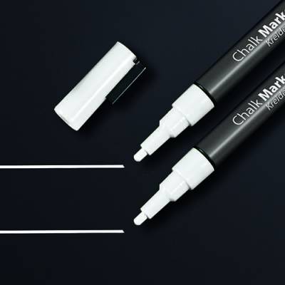 The white chalk marker with the 1-2 mm rounded tip writes with an opaque liquid chalk and are suitable for use on smooth glass and almost all sealed surfaces. The water-based chalk can be wiped off with a damp or dry cloth.