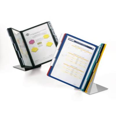 The DURABLE VARIO® range is a robust and economical display panel system with a sturdy metal base. Ideal for use in industrial areas and offices. This desk unit includes 10 A4 display panels and tabs. The panels are anti-glare and copy-proof which makes it easy to use. Great for holding health and safety instructions, machine manuals, etc.