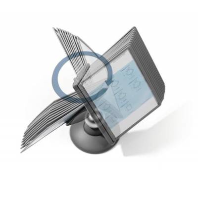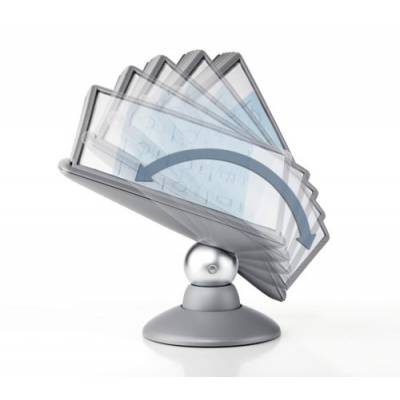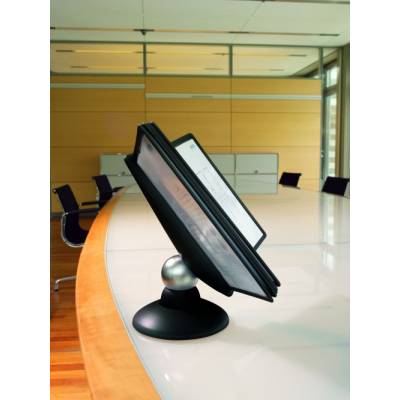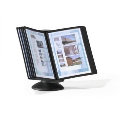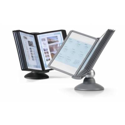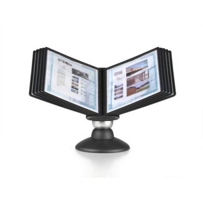 Rotating table stand with 10 SHERPA® display panels in A4 format. Complete with index tabs and blank insert cards. A galvanised ball connects the bracket holding the panels with a firm base that allows 360° rotation. Reading angle variable from 25° to 70°. Ideal for a wide range of applications: use in the workplace when standing or sitting, position between several workstations or simply use to assist the daily working routine