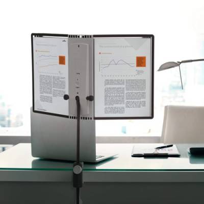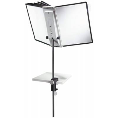 Complete set consisting of a desk clamp and 10 Black A4 polypropylene display panels. The desk clamp length is adjustable up to 78 cm and can be secured to desk and table tops with a thickness of up to 50mm. The reading angle is also variable between 5 and 90°.