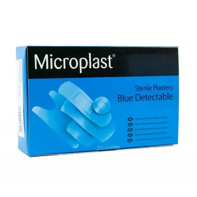 - Microplast Blue Detectable Plasters are for catering cuts and grazes. They feature a metal detectable aluminium sheet under the pad, ideal for food processing areas, preventing contamination. They're hypoallergenic, non-cytotoxic, latex-free, and visually detectable due to their blue colour, meeting ISO 10993 standards.