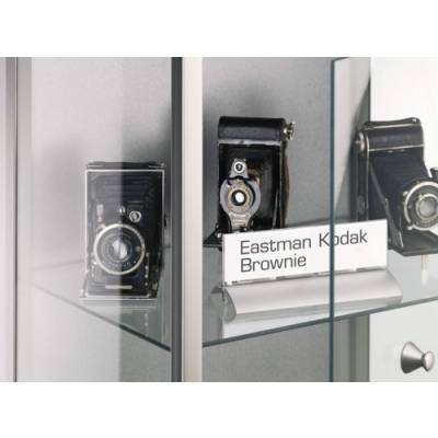- German design modern acrylic place name holder with aluminium base. A unique gripping system holds the acrylic panel securely in place. Ideal for conferences, receptions, counters, and display window price tags.