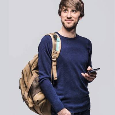 Modern German-designed badge reel with key ring fastener compatible with keychains and hand sanitisers. The reel features a secure carabiner for attaching to pockets or belts.