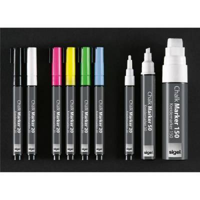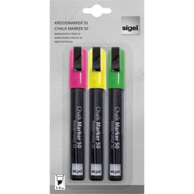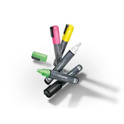 - The three chalk markers 50 in pink, green and yellow with the 1-5 mm chisel tip write with opaque liquid chalk and are suitable for use on smooth glass and sealed surfaces. The water-based chalk can be wiped off with a damp or dry cloth.