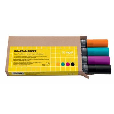 - The pens from the SIGEL range come in strong, bright colours, ideal for writing on smooth surfaces in the office, home office and around the home. The easy-to-erase board marker (black, turquoise, magenta, orange, odourless ink, free from toluene and xylene, 4 pens in a set) with a round nib for fast, smooth writing can be used for white glass magnet boards, whiteboards and flipcharts.