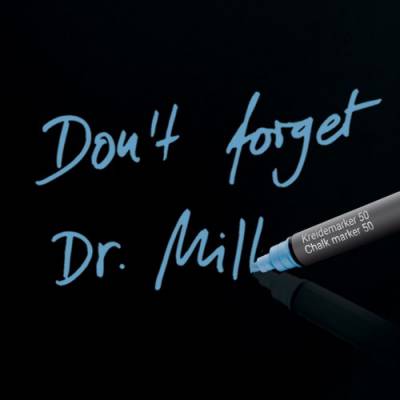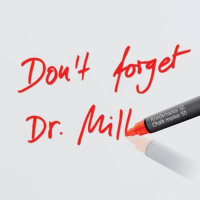 - The two chalk markers 50 in blue and red, with a 1-5 mm chisel tip, write with opaque liquid chalk and are suitable for use on smooth glass and sealed surfaces. The water-based chalk can be erased with a damp or dry cloth.